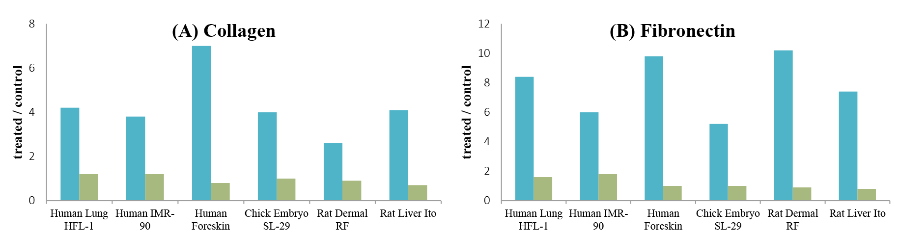 were treated with 50 μM AGDP®. Quantitation of extracellularly released radiolabeled procollagen and fibronectin was accomplished and data are shown as mean ± S.E. derived from three independent experiments. The result is indicated that AGDP® can stimulate production of matrix molecules such as collagen and fibronectin from several fibroblast cell lines of human, mouse, rat, and chicken origin.
