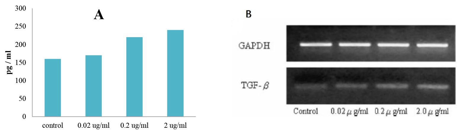 and 164.7±6.0 pg/mL, 212.7±2.8 pg/mL, and 240.4±17.4 pg/mL for the cells treated with 0.02, 0.2, and 2.0 μg/mL of AGDP®, respectively (Fig.3A). RT-PCR of TGF-β also revealed gradual increase in TGF-β expression at the mRNA level as a function of AGDP® concentration (Fig.3B).
