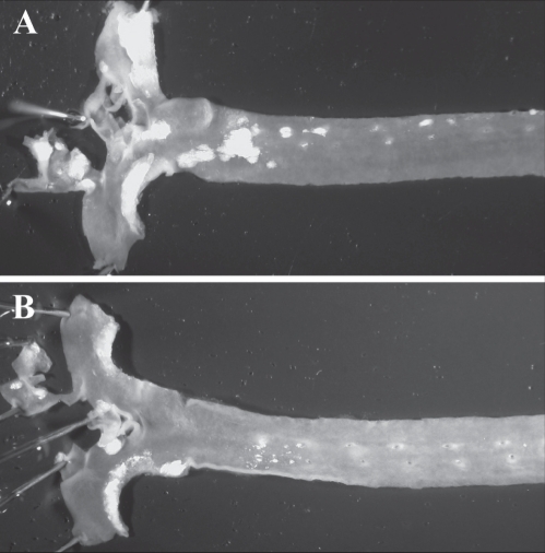 Atherosclerotic plaque formation in representative aortas taken from low-density lipoprotein receptor-deficient mice fed for 24 weeks with a diet supplemented with 2% cholesterol represented by picture (A) or a diet supplemented with 2% cholesterol and 10% flaxseed
